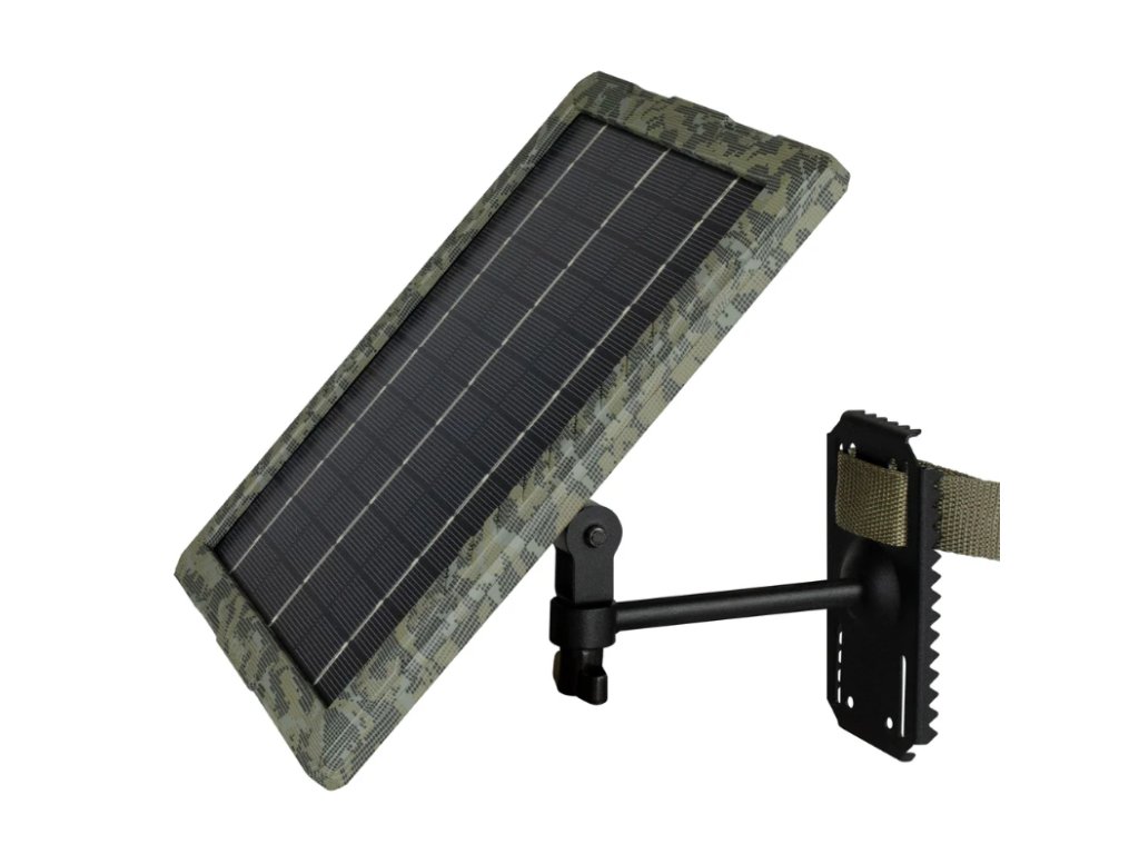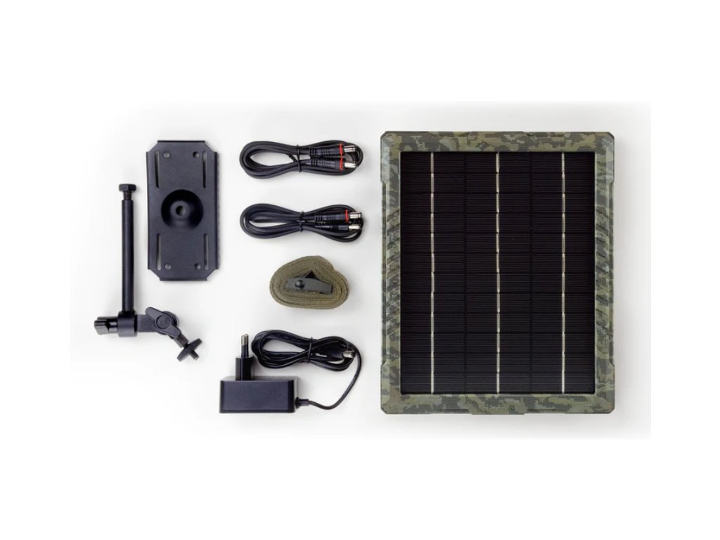 Solární panel včetně držáku pro montáž a popruhu na strom – součástí je také nabíjecí kabel, umožňuje téměř neomezenou doba provozu.